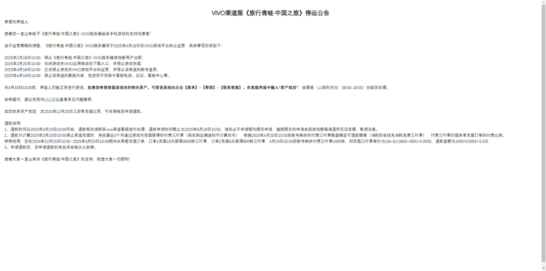 这几天,游戏《旅行青蛙·中国之旅》官网的一则停运公告引起了玩家们的筹商。官方晓谕,由于运营战术调度,《旅行青蛙·中国之旅》VIVO劳动器将在4月19日断绝运营。看到这条音信不少网友唏嘘,也曾热度力压《王者荣耀》的《旅行青蛙》照旧没能逃过玩家流失最终缓缓死灭的流程。